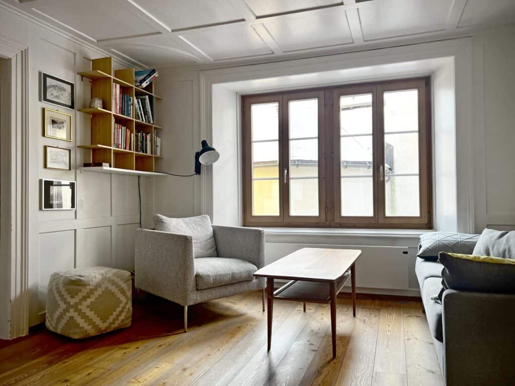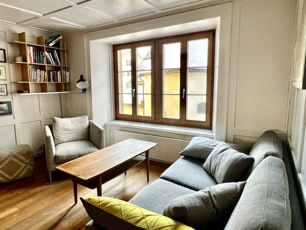 Die Wohnung bietet ein Schlafzimmer, eine Stube, eine Wohnküche und ein weiteres Schlafzimmer. Sie wurde von der Besitzerfamilie mit Liebe zum Detail saniert. Die Räume sind in einer Kombination von echten alten Bauernmöbeln und modernem Komfort geschmackvoll eingerichtet.