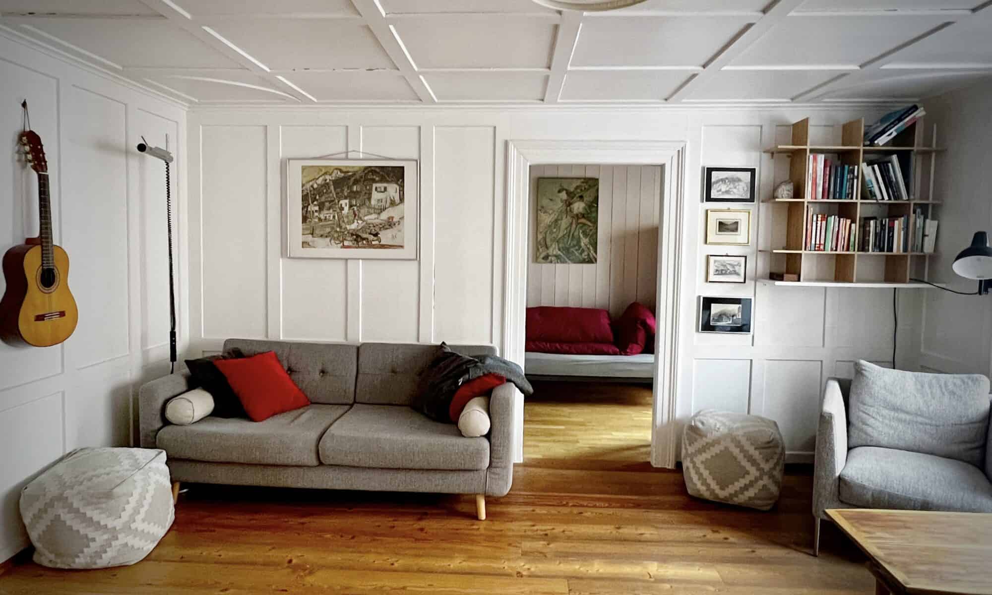 Die Wohnung bietet ein Schlafzimmer, eine Stube, eine Wohnküche und ein weiteres Schlafzimmer. Sie wurde von der Besitzerfamilie mit Liebe zum Detail saniert. Die Räume sind in einer Kombination von echten alten Bauernmöbeln und modernem Komfort geschmackvoll eingerichtet.